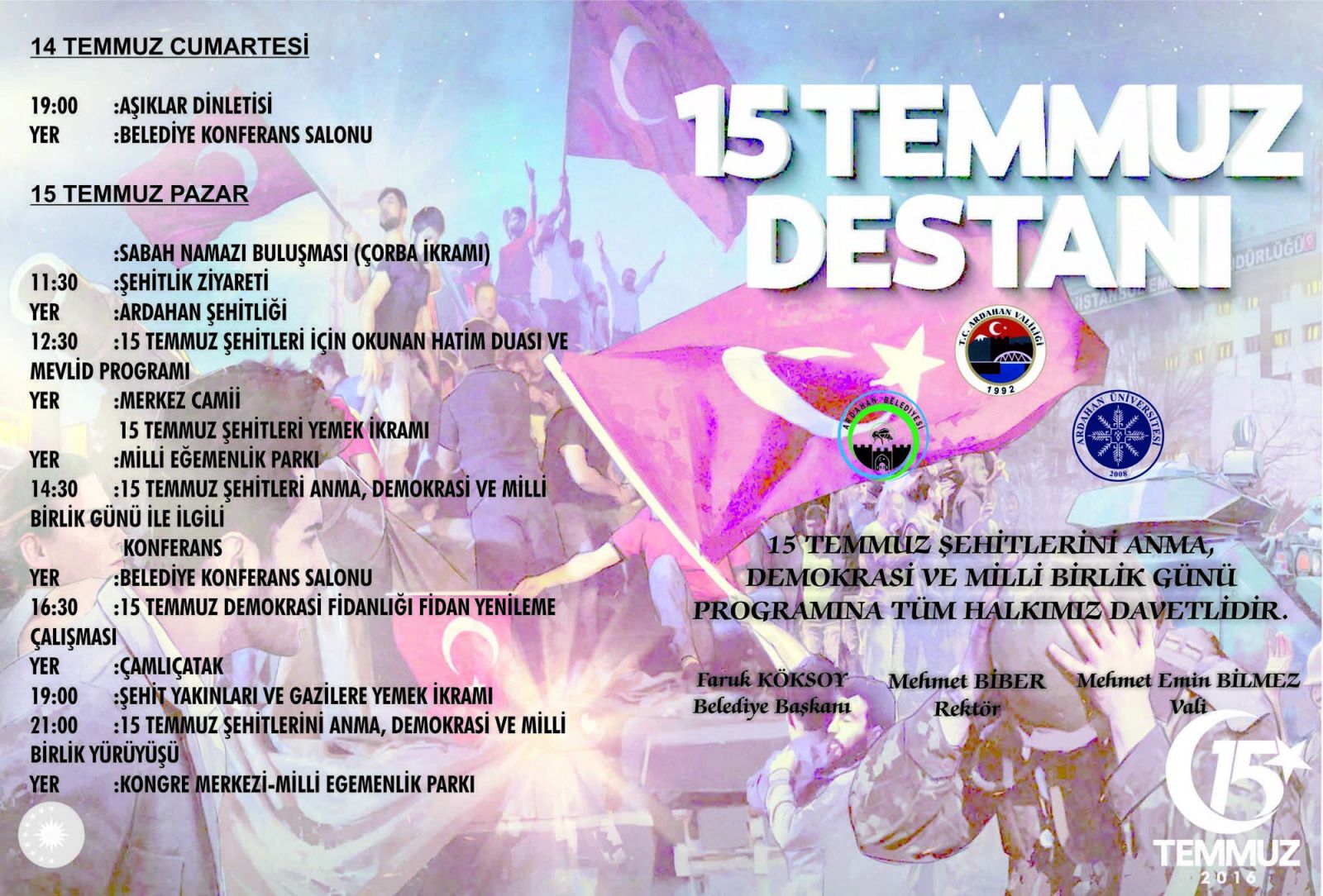 ARDAHAN’da 15 Temmuz Darbe kalkışmasının ikinci yıldönümü dolayısıyla "Şehitleri Anma, Demokrasi ve Milli Birlik Günü" etkinlikleri Ardahan Valili, Ardahan Belediyesi ve Ardahan Üniversitesince hazırlanan programlarla gerçekleştirilecek.