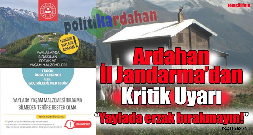 “Yaylacılık faaliyetlerinin yoğun bir şekilde yaşandığı Ardahan ili genelinde havaların soğumaya başlamasıyla yaylaları boşaltan ve köylerine dönen vatandaşlara Ardahan İl Jandarma Komutanlığından “Yaylalarda erzak bırakma, bilmeden teröre destek olma” afişi hazırlanarak yaylalarda erzak bırakılmaması yönünde uyarılarda bulunuldu” denildi.