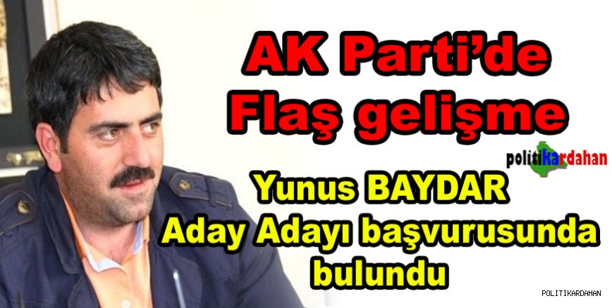 AK Parti’nin kilit isimlerinden olan Veteriner Hekim Yunus Baydar’ın belediye başkanlığı için aday olup olmayacağı netlik kazandı. Baydar, başvuru tarihinin son gününde AK Parti İl Başkanlığına giderek aday adaylığı başvurusunda bulundu.
