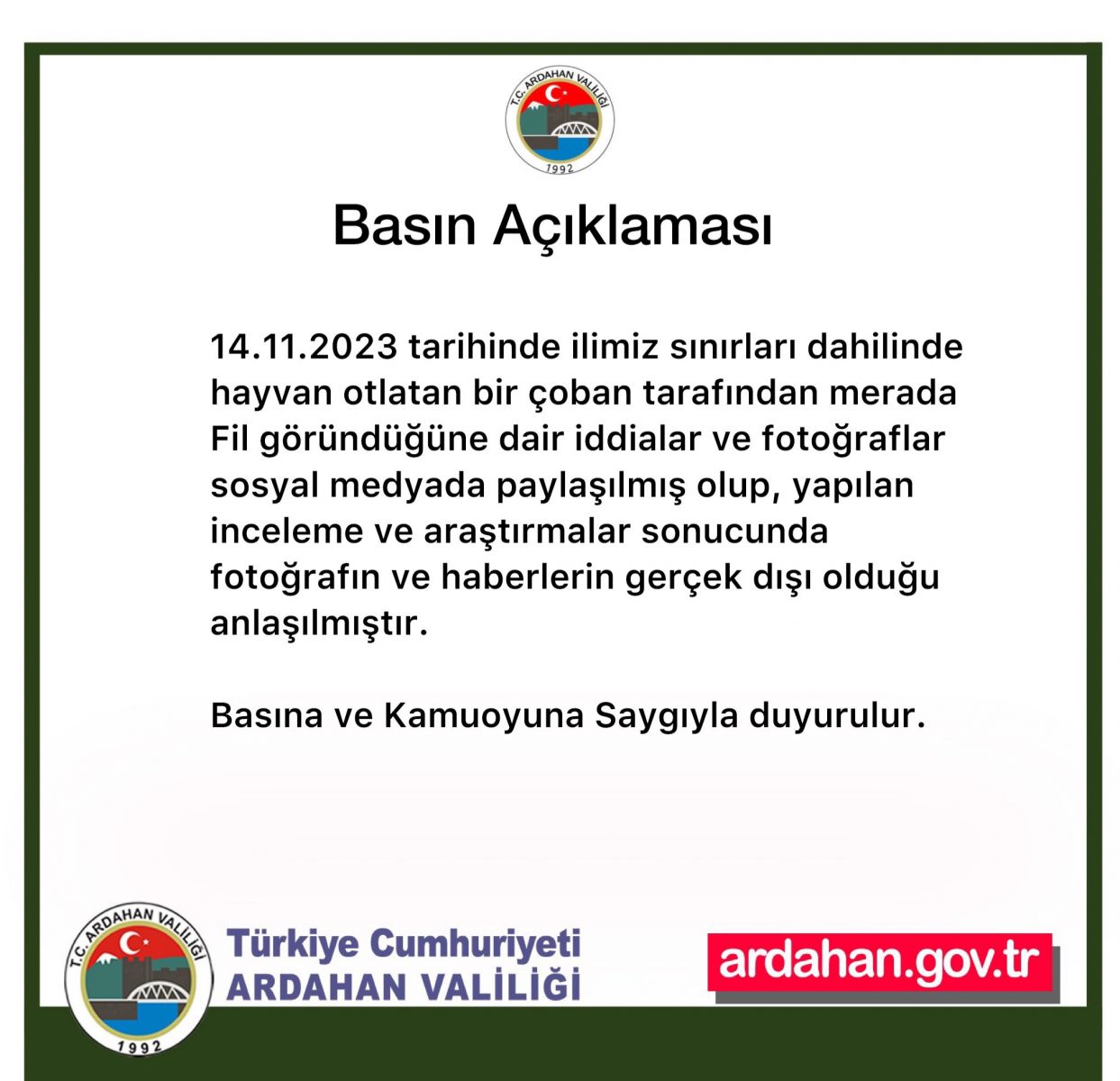 "Ardahan ilimizde fil görüldüğü iddiası tamamen uydurmadır. Kamuoyunun bilgisine sunarım." dedi.