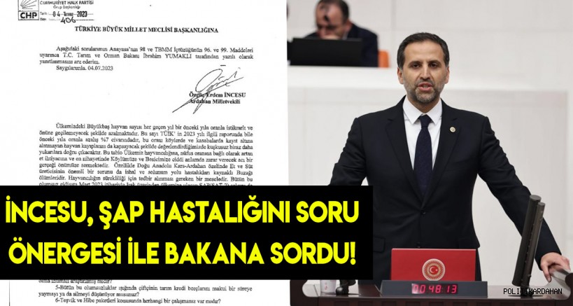 CHP Ardahan Milletvekili Özgür Erdem İncesu, Ardahan başta olmak üzere tüm birçok ilde görülen hayvancılık sektörünün önemli sorunlarından biri olan şap hastalığı ile ilgili Tarım ve Orman Bakanı İbrahim Yumaklı tarafından yanıtlanması talebiyle 6 maddelik soru önergesi hazırladı. İncesu, bölgemiz hayvancılığını felaketin eşiğine getiren Şap Sat-2 Serotipi salgınının yıkıcı sonuçlarını dile getirerek, acilen alınması gereken önlemleri, teşvik ve hibe paketleri önerilerini içeren soru önergesini Tarım Bakanlığı'na iletti.