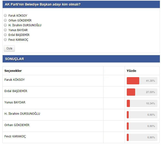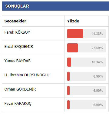 3 bin 248 kişinin oy kullandığı ankette mevcut Belediye Başkanı Faruk Köksoy %41.38, ARÜ İdari ve Mali İşler Daire Başkanlığı Şube Müdürü Erdal Başdemir %27.59, Veteriner Hekim Yunus Baydar %10.43 oranında oy aldı. Ankette ki diğer isimler, Orhan Gökdemir, Yunus Baydar, Fevzi Karakoç, Halil İbrahim Dursunoğlu ise %6.90’da bandında kaldı.