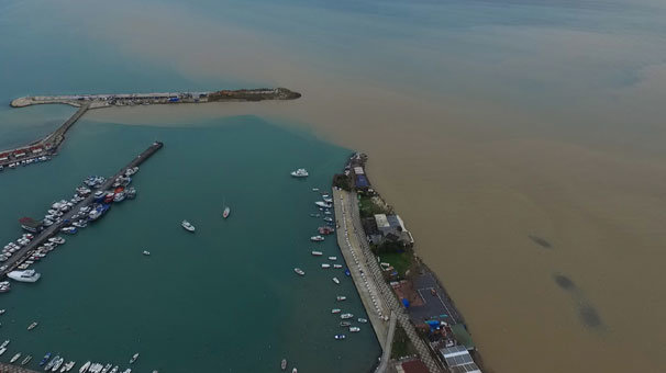 Denizin özellikle sahile yakın olan kısmı kahverengine büründü. Renk değiştiren deniz havadan görüntülendi.