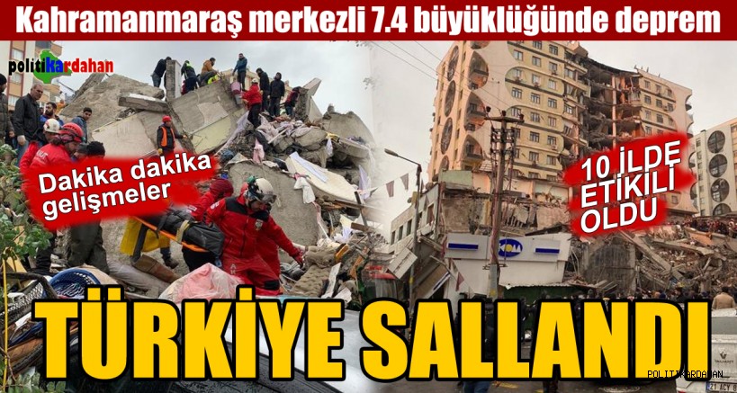 Yurdun, Doğu, Güneydoğu, İç Anadolu ve Akdeniz bölgesinde birçok il, saat 04.17'de Kahramanmaraş merkezli Richter ölçeğine göre 7.4 büyüklüğünde depremle sallandı. AFAD'dan alınan bilgiye göre yerin 7 kilometre derinliğinde meydana gelen deprem, yurdun büyük büyük bölümünden hissedildi. Birçok ilden can kaybı haberleri geldi. Sarsıntıyla birlikte yataklarından kalkan vatandaşlar sokaklara kaçıştı. Depremin ardından birçok ilde peş peşe artçı depremler meydana geldi. İşte dakika dakika gelişmeler...Yurdun, Doğu, Güneydoğu, İç Anadolu ve Akdeniz bölgesinde birçok il, saat 04.17'de Kahramanmaraş merkezli Richter ölçeğine göre 7.4 büyüklüğünde depremle sallandı. AFAD'dan alınan bilgiye göre yerin 7 kilometre derinliğinde meydana gelen deprem, yurdun büyük büyük bölümünden hissedildi. Birçok ilden can kaybı haberleri geldi. Sarsıntıyla birlikte yataklarından kalkan vatandaşlar sokaklara kaçıştı. Depremin ardından birçok ilde peş peşe artçı depremler meydana geldi. İşte dakika dakika gelişmeler...