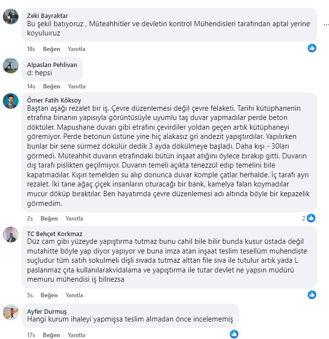 AK Parti Belediye Meclis Üyesi Ömer Fatih Köksoy, sosyal medya hesabında yaptığı yorumda, çalışmaları sert sözlerle eleştirdi. Köksoy: “Baştan aşağı rezalet bir iş. Çevre düzenlemesi değil çevre felaketi. Tarihi kütüphanenin etrafına binanın yapısıyla uyumlu taş duvar yapmadılar, perde beton döktüler. Mapushane duvarı gibi etrafını çevirdiler, yoldan geçen artık kütüphaneyi göremiyor. Perde betonun üstüne yine hiç alakasız gri andezit yapıştırdılar. Yapılırken ‘bir sene sürmez dökülür’ dedik, 3 ayda dökülmeye başladı. Daha kışı -30’ları görmedi” dedi.